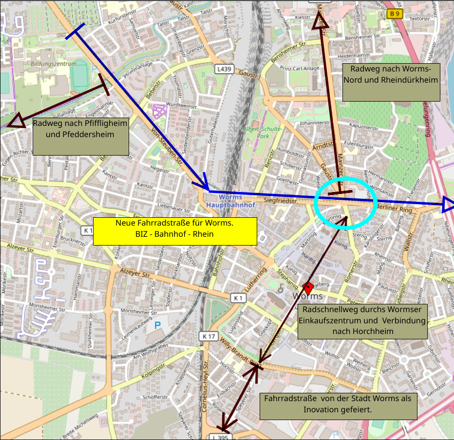 Fahrradanschluß zur *Womser Innenstadt* und zum *Bahnhof* und *Festplatz*. Wormser *Schulen* werden mit dem Bahnhof verbunden. Karmeliter Real und Grund ,BIZ, Nibelungenschule. Das Ärtztehaus liegt auch an der neuen Fahradstraße.